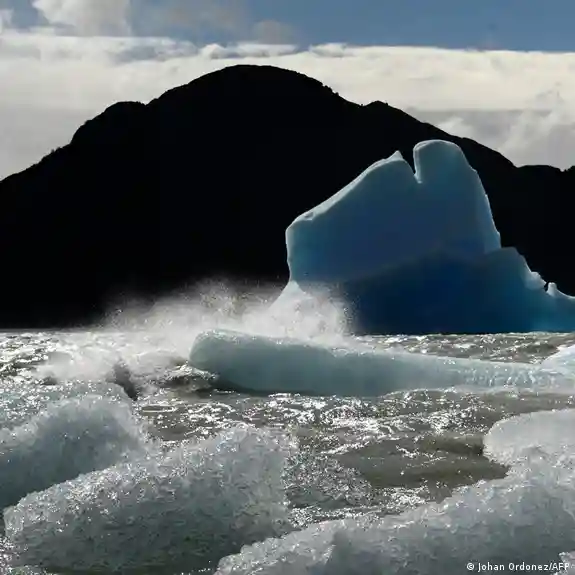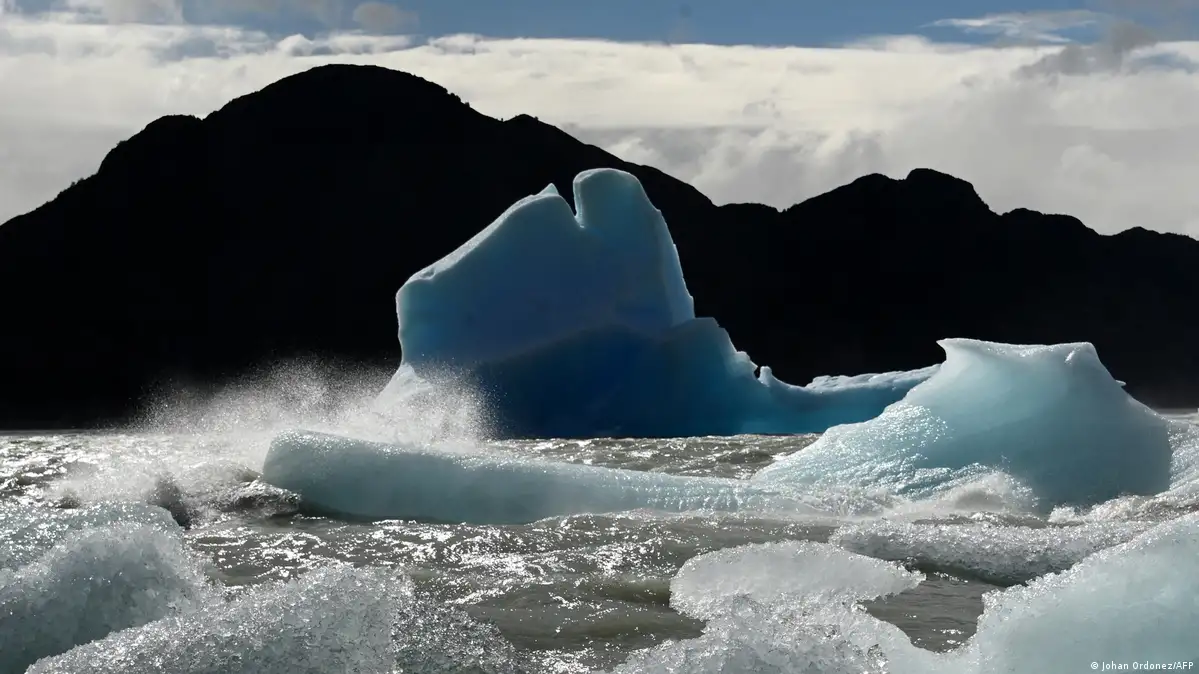 Vista de un glaciar en el Parque Nacional Torres del Paine, Chile, con grandes bloques de hielo flotando sobre el agua en un paisaje montañoso.