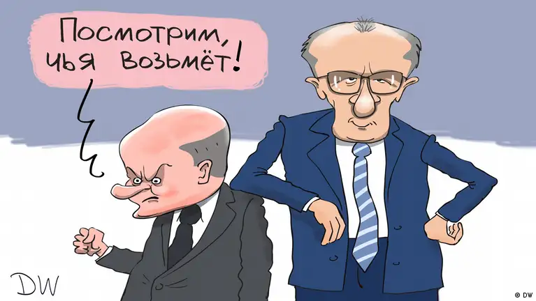 Теледебаты канцлера ФРГ Олафа Шольца и лидера оппозиции Фридриха Мерца не выявили победителя. Хотя консерваторы во главе с Мерцем лидируют в опросах, Шольц не сдается. Кто же станет новым канцлером? Карикатура DW.